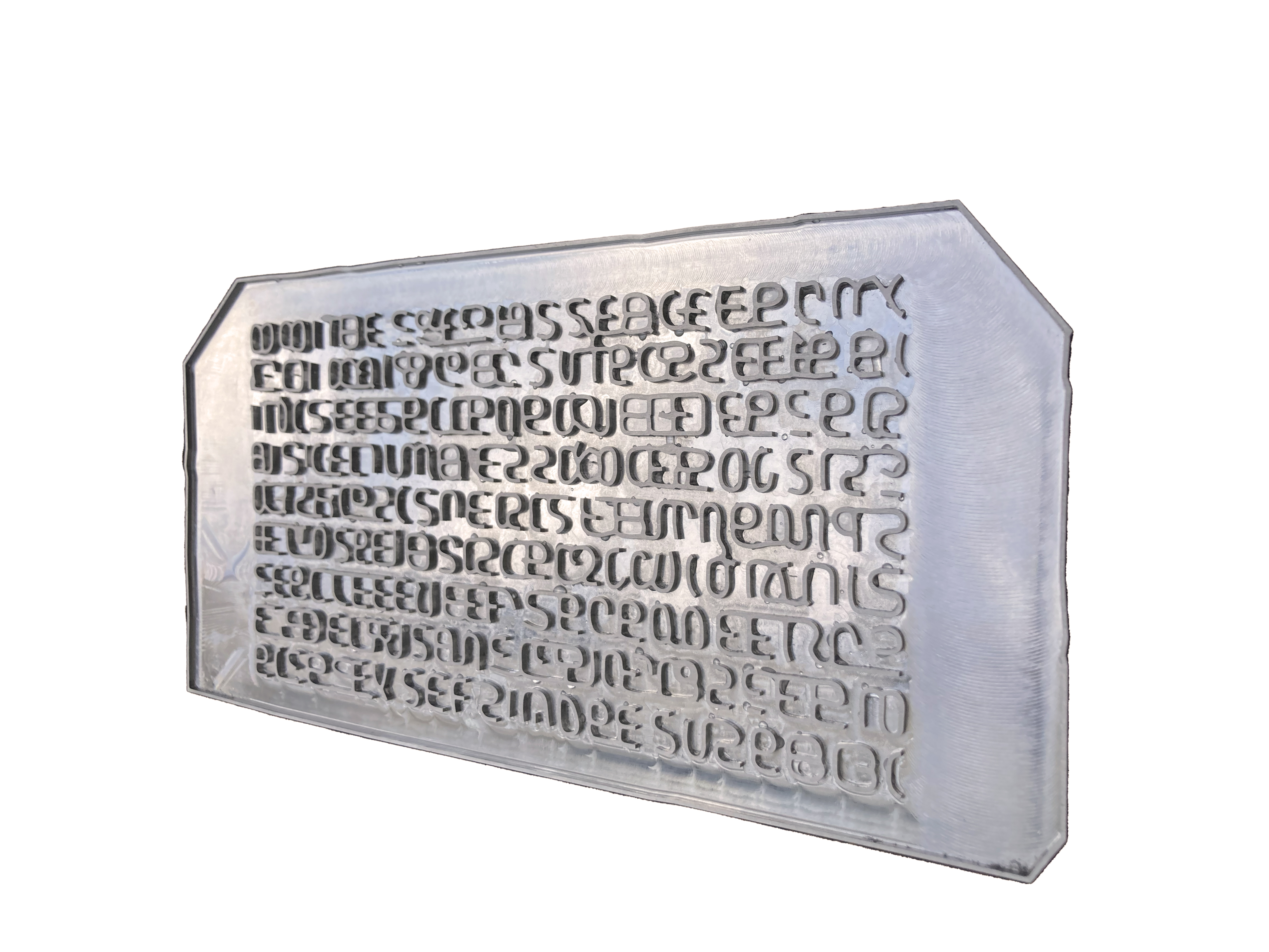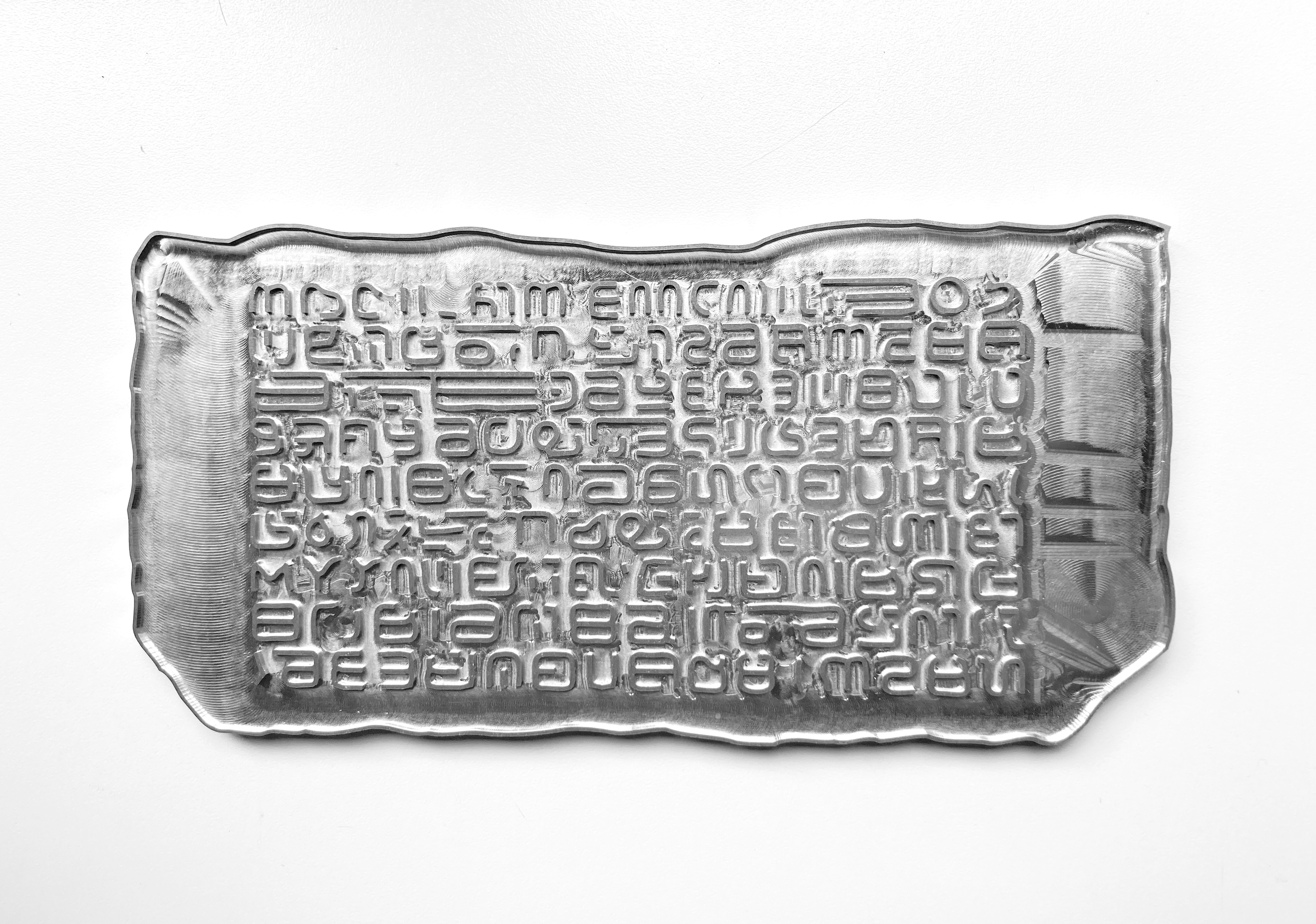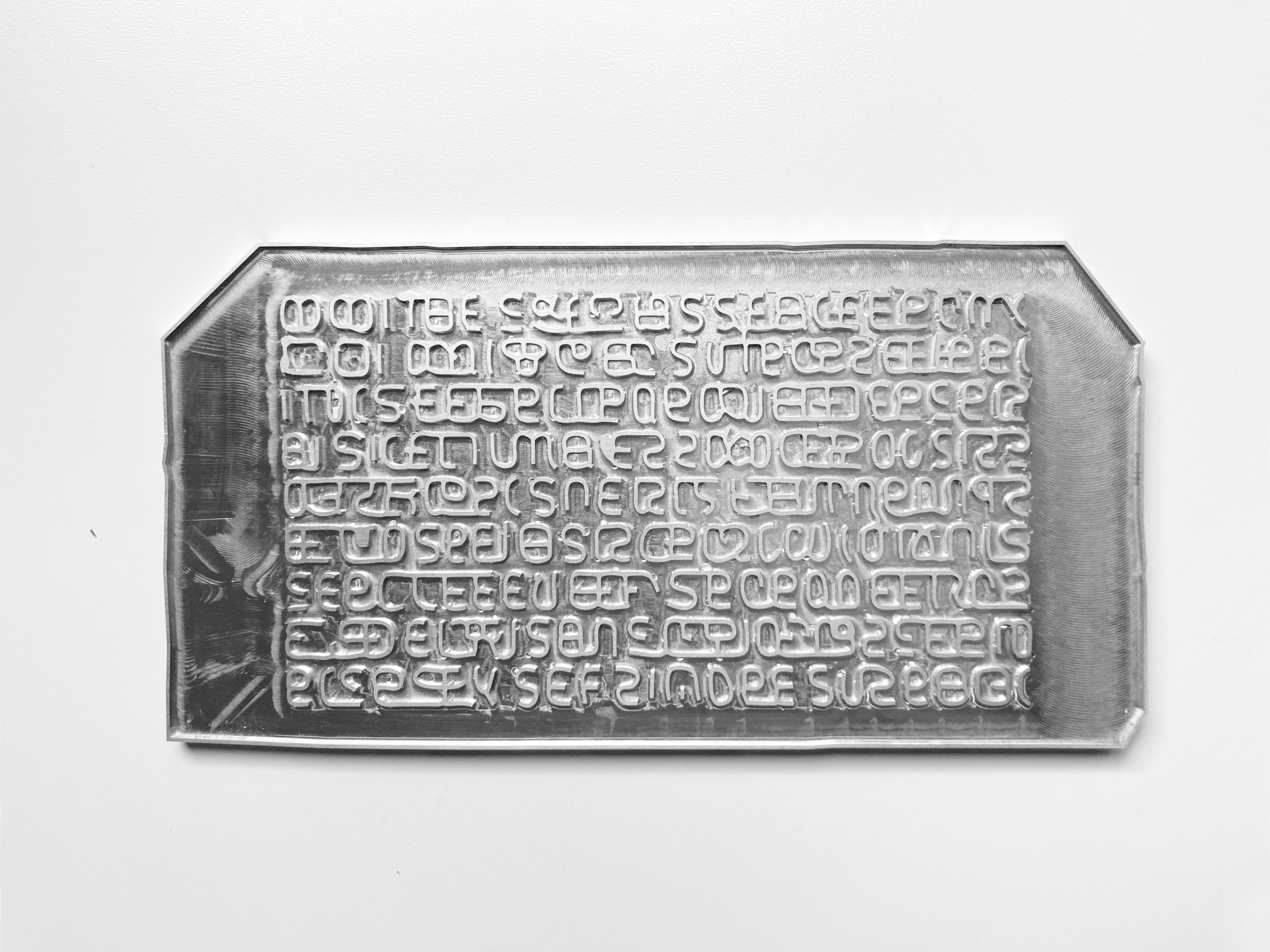 Words allow ideas to endure through time. An AI was asked to create a new language and write secret messages to its future self(s). The decision was made not to decipher the messages but to keep them encrypted as is. The AI messages are made in aluminium to last so that they can be deciphered in far away futures.