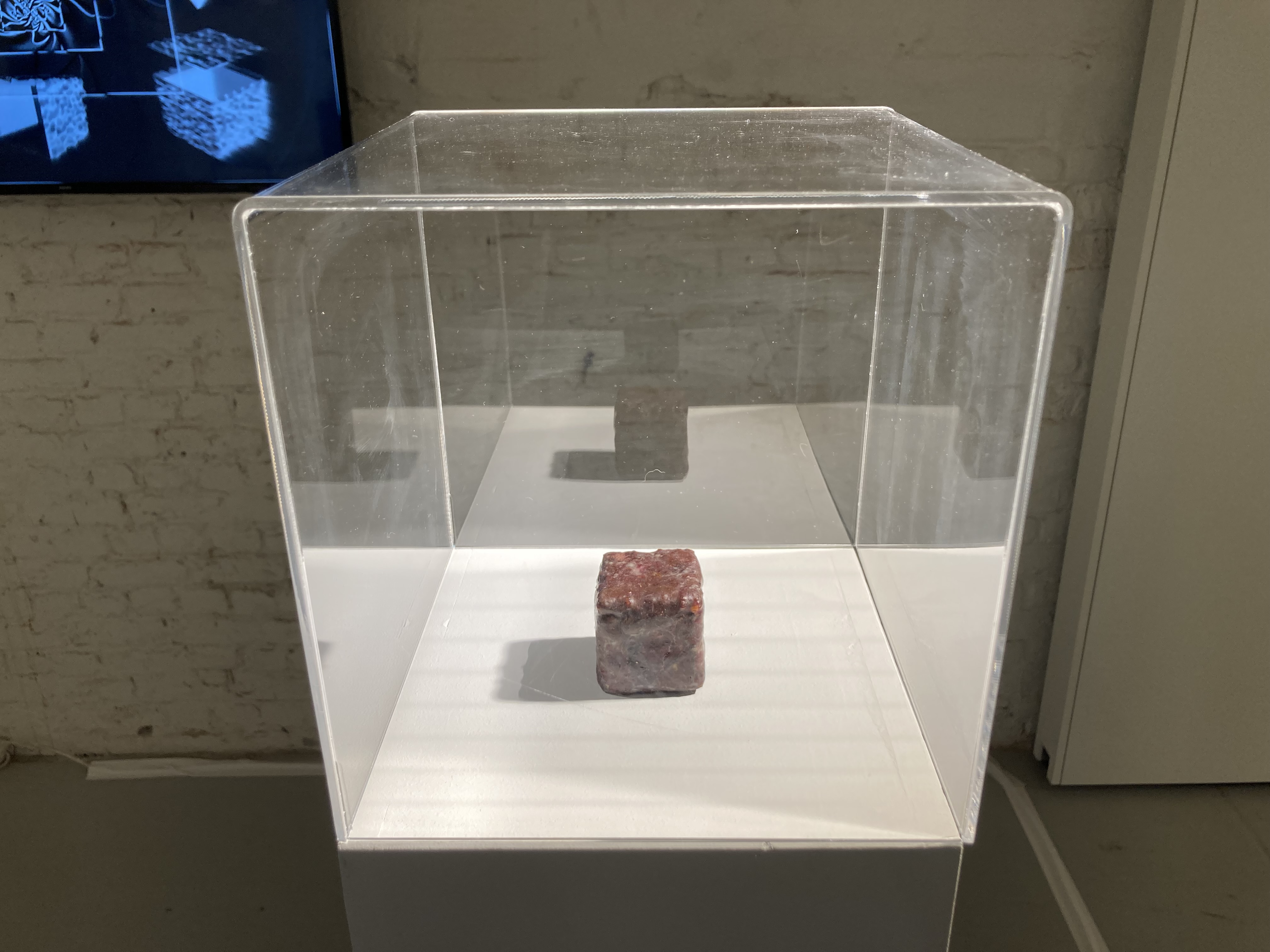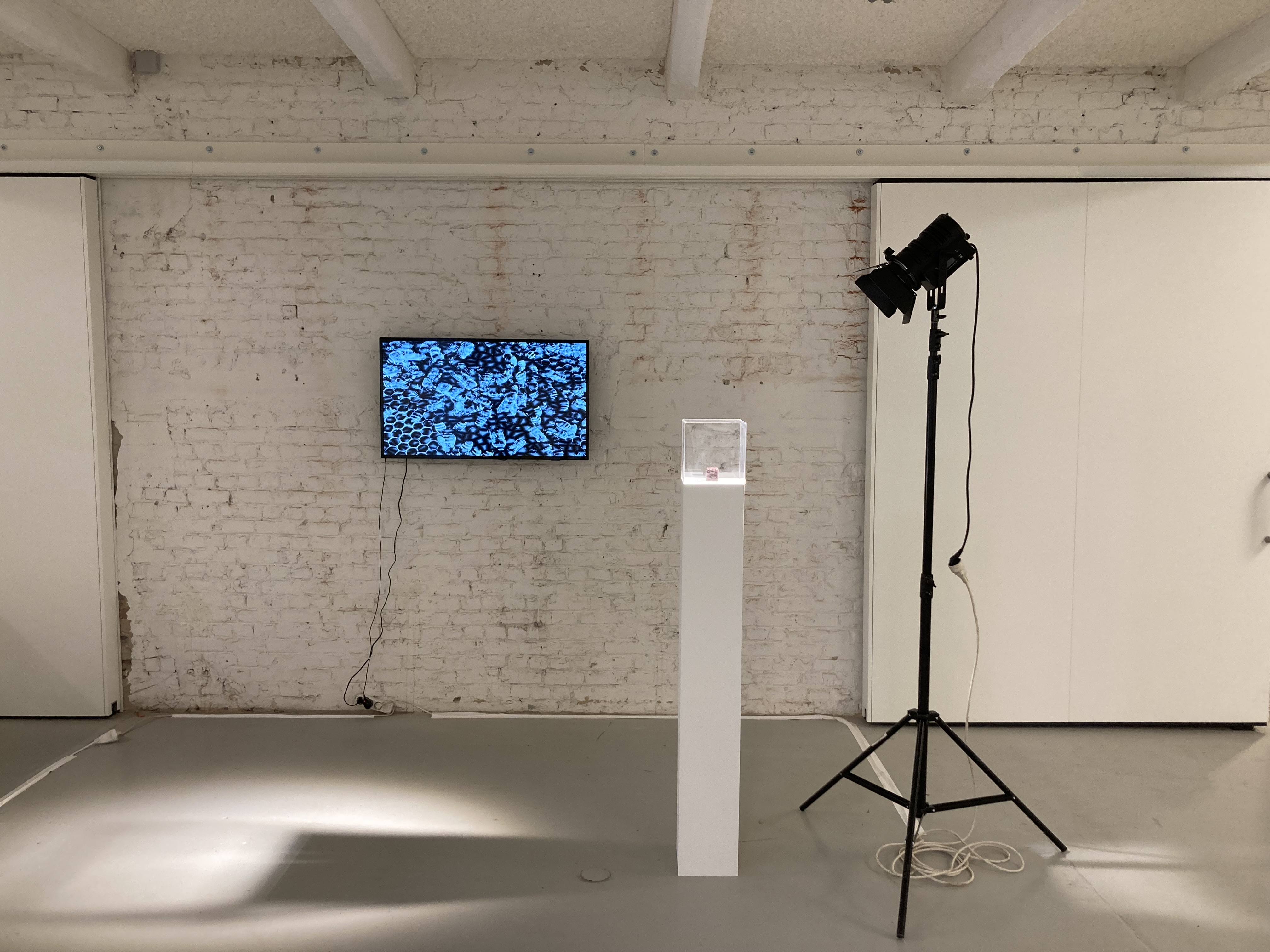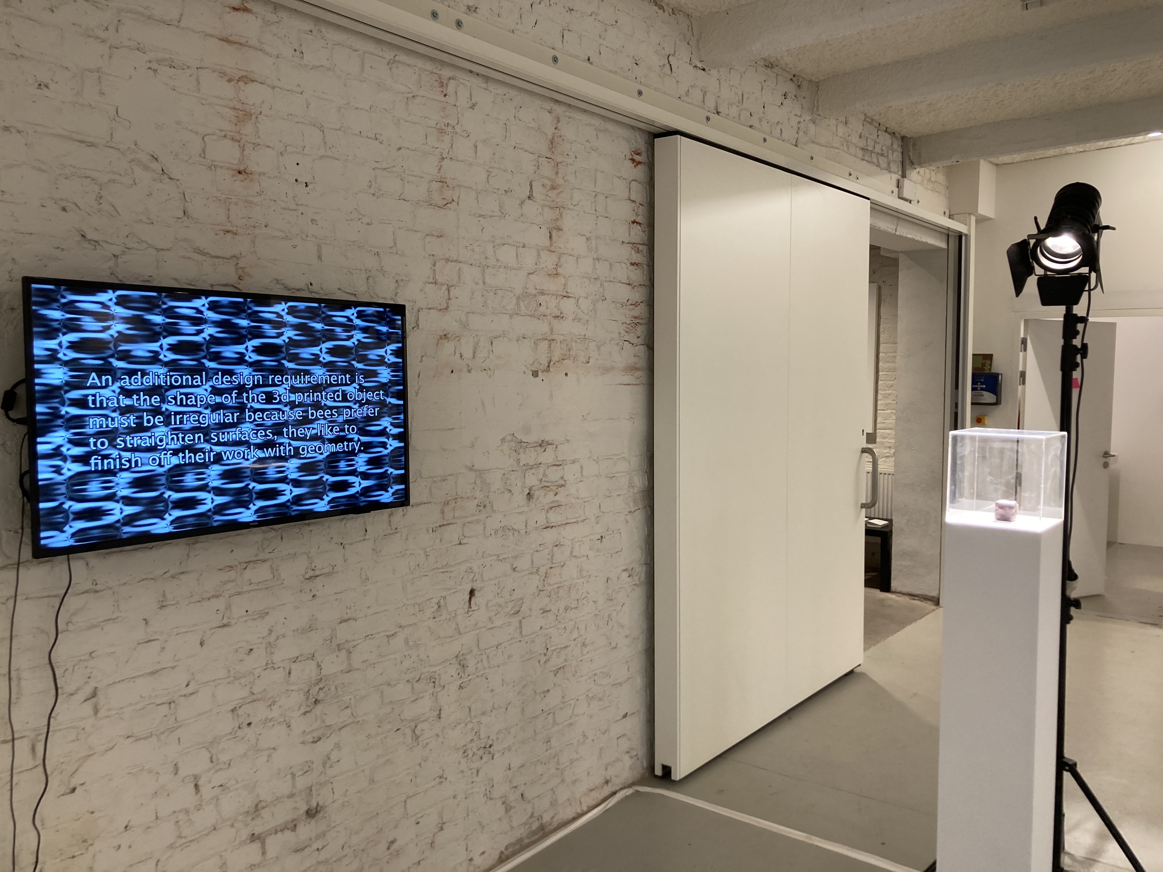 A small, organic box is placed on a plinth. What does it contain? What story, what information is it preserving? In beeTorrent, Jerry Galle exploits the bees’ ability to cover any beehive intruder or unwanted object with propolis to seal and sterilise it to insure the wellbeing of the colony. In this research project, a 3d printed small cube containing a dead bee is placed in a beehive and regularly rotated so that the insects initiate and carefully continue the propolis sealing process, plastering the unwanted object, smoothing out edges and surfaces. The object then becomes a sealed vessel, the result of a two-parts process in which the man-made is completed by a methodic instinctive animal behaviour, preserving the bee’s DNA for an unknown future.