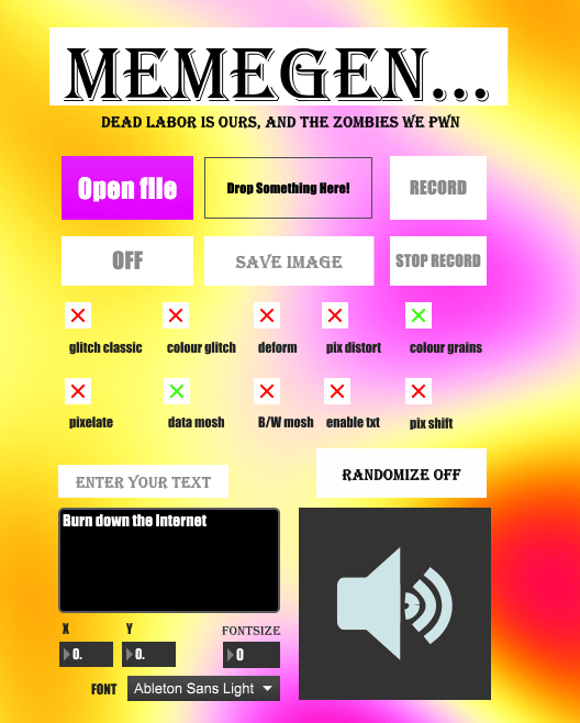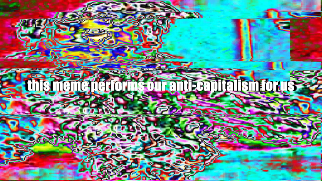Software written in Max Msp to rehash and create static, corrupted, parasitized, delayed and glitched memes. Although glitch techniques have become mainstream, a fully glitched image remains difficult to market because of its shifting layers and inherent elusive content. Maybe glitched images could jolt us out of the rigid everyday way of thinking that capital imposes on us, be it even for a brief moment. Our every online action feeds into the data economy, but to glitch this data is to render it semi-unusable. To scramble content with layers of abstraction and noise, whilst still somehow communicating its intentions, memenesia’s output is perhaps less prone to commodification.