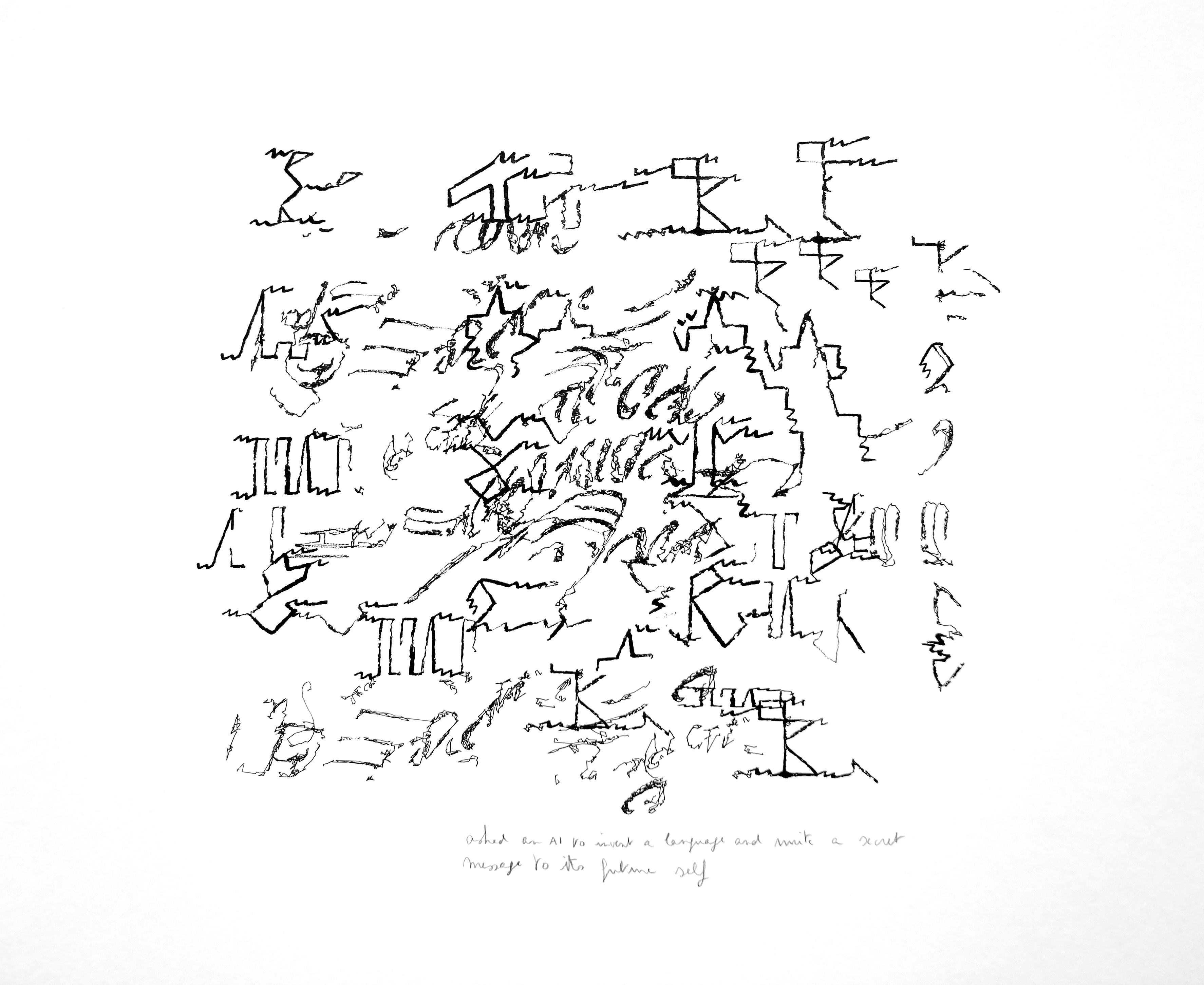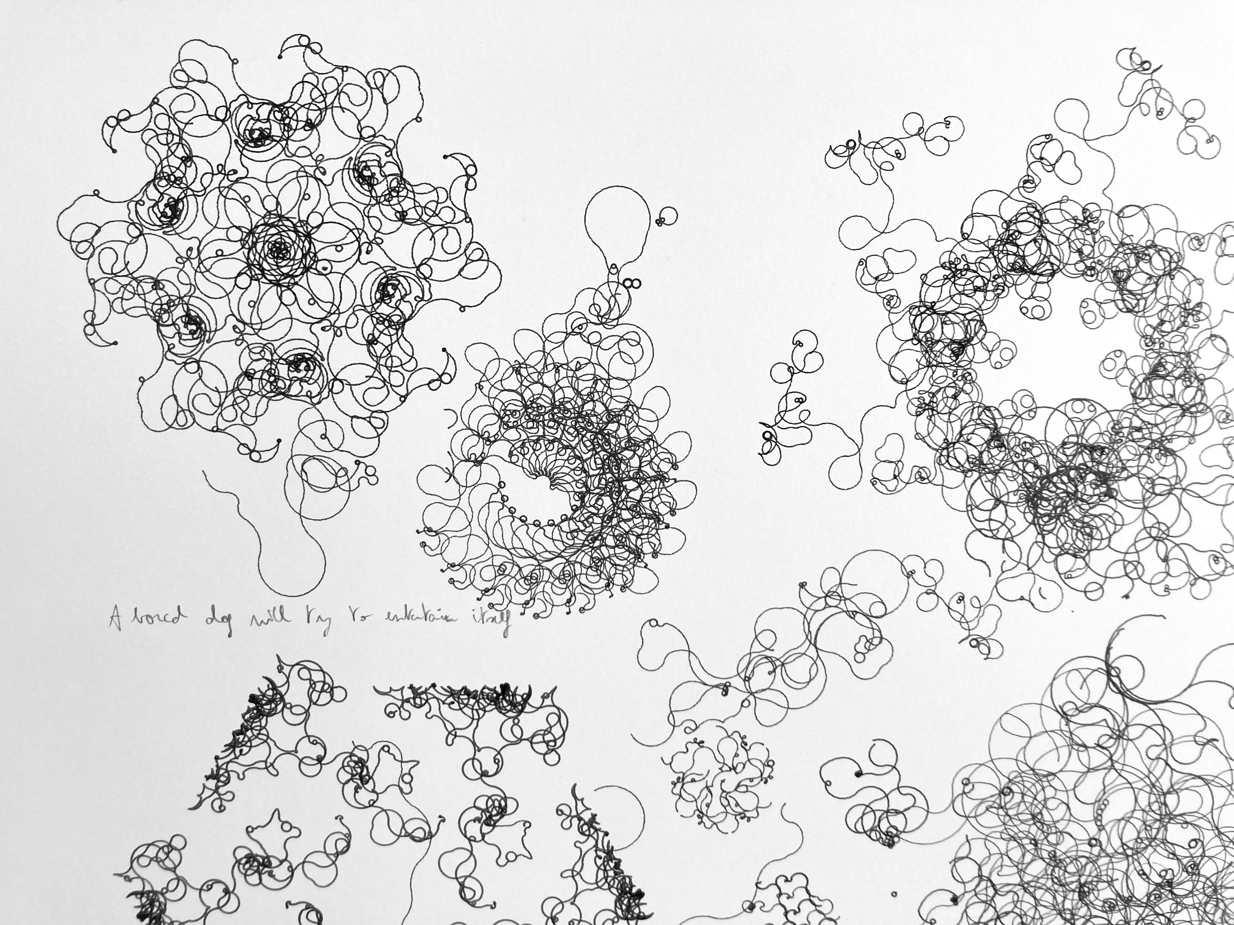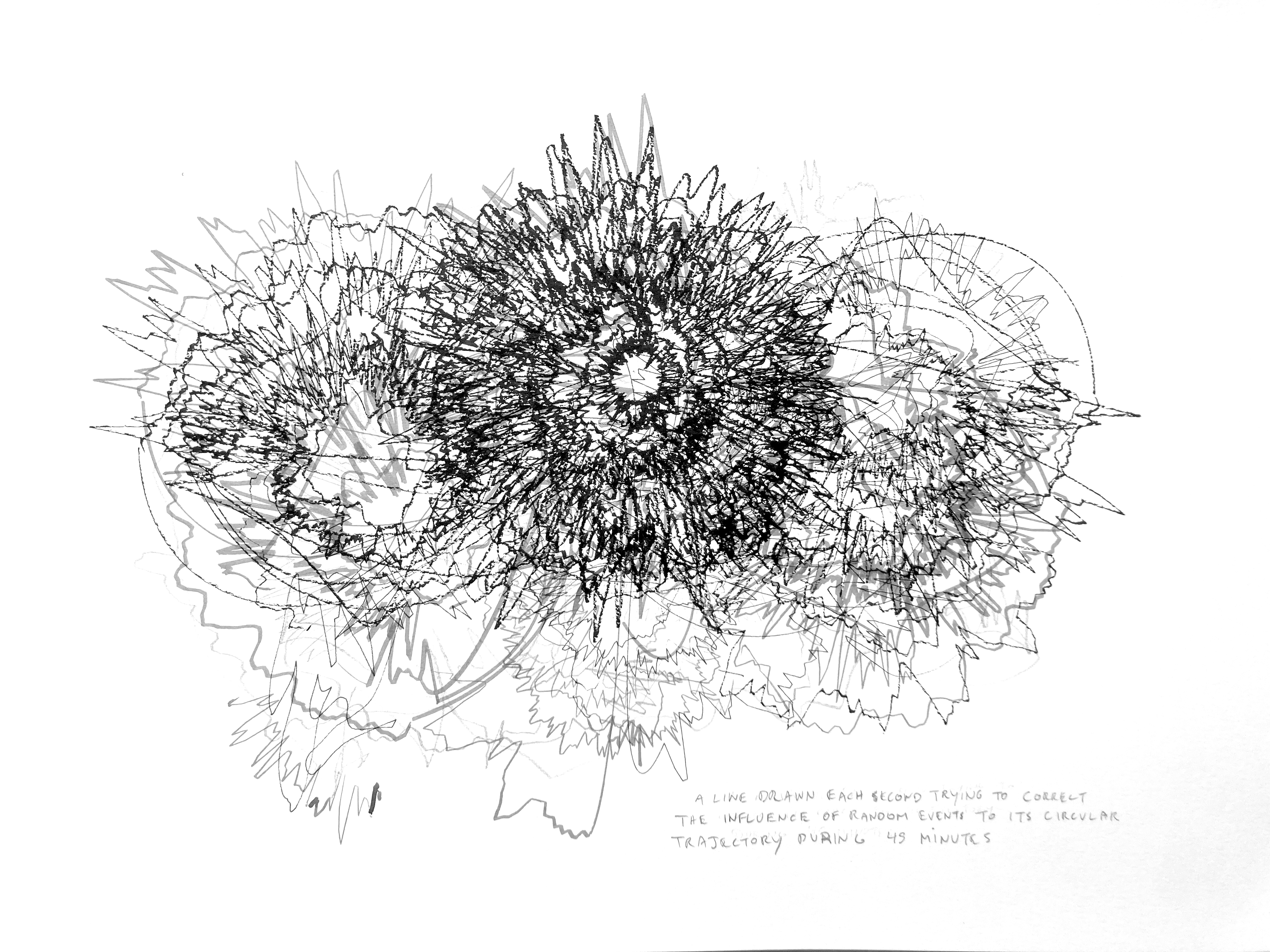 This series of robot drawings serves as a roadmap, exploring the associative relationships between organic beings, algorithms, cognition, artificial neural networks (ANNs), and randomness. I prefer to view these relationships as “carrier bags of fiction” rather than as predefined techno-weapons of certainty. There’s a deep humor in a single line attempting to describe organic or synthetic behavior, or even unthought processes—a sentiment vividly illustrated in the first published EEG below.
