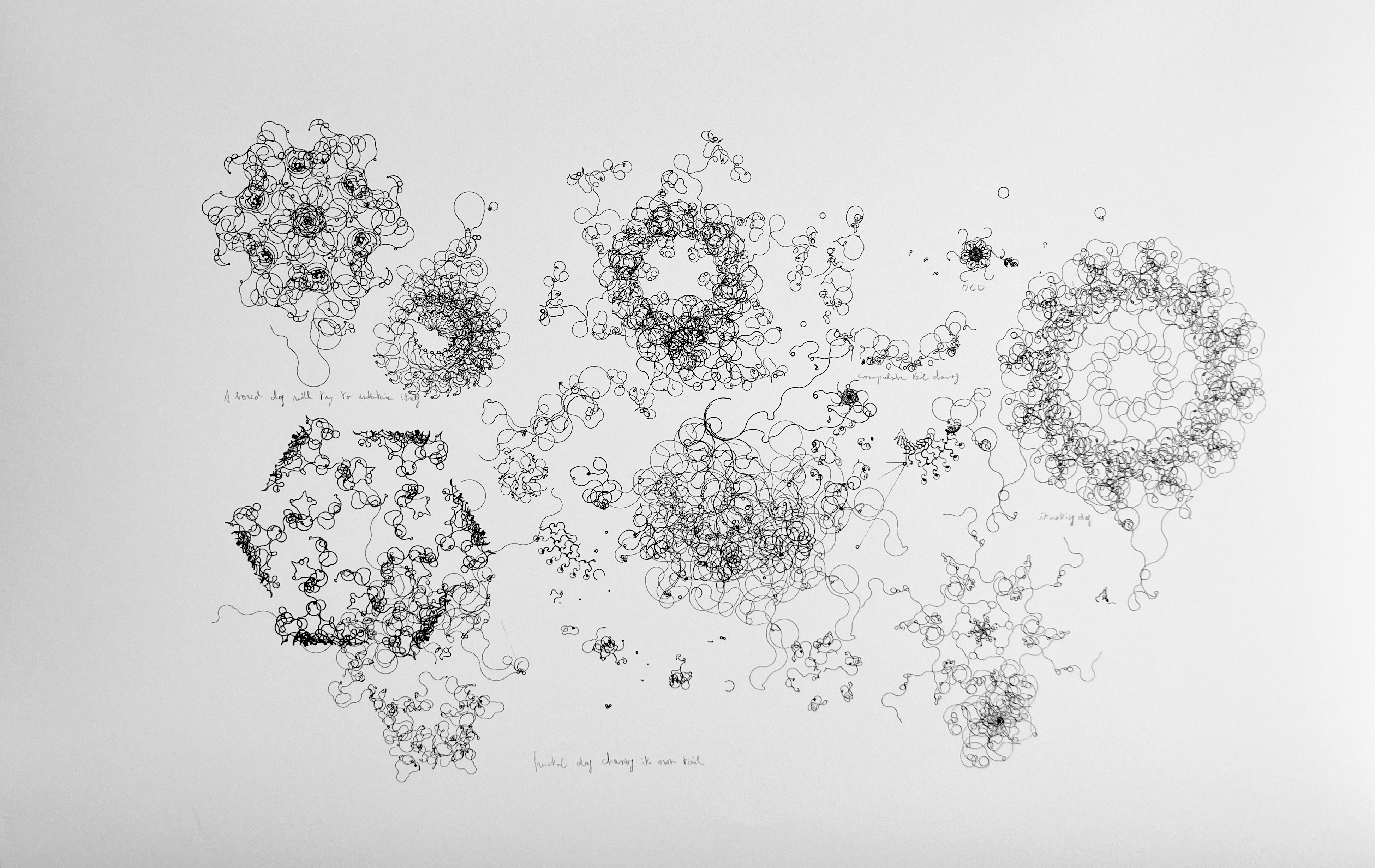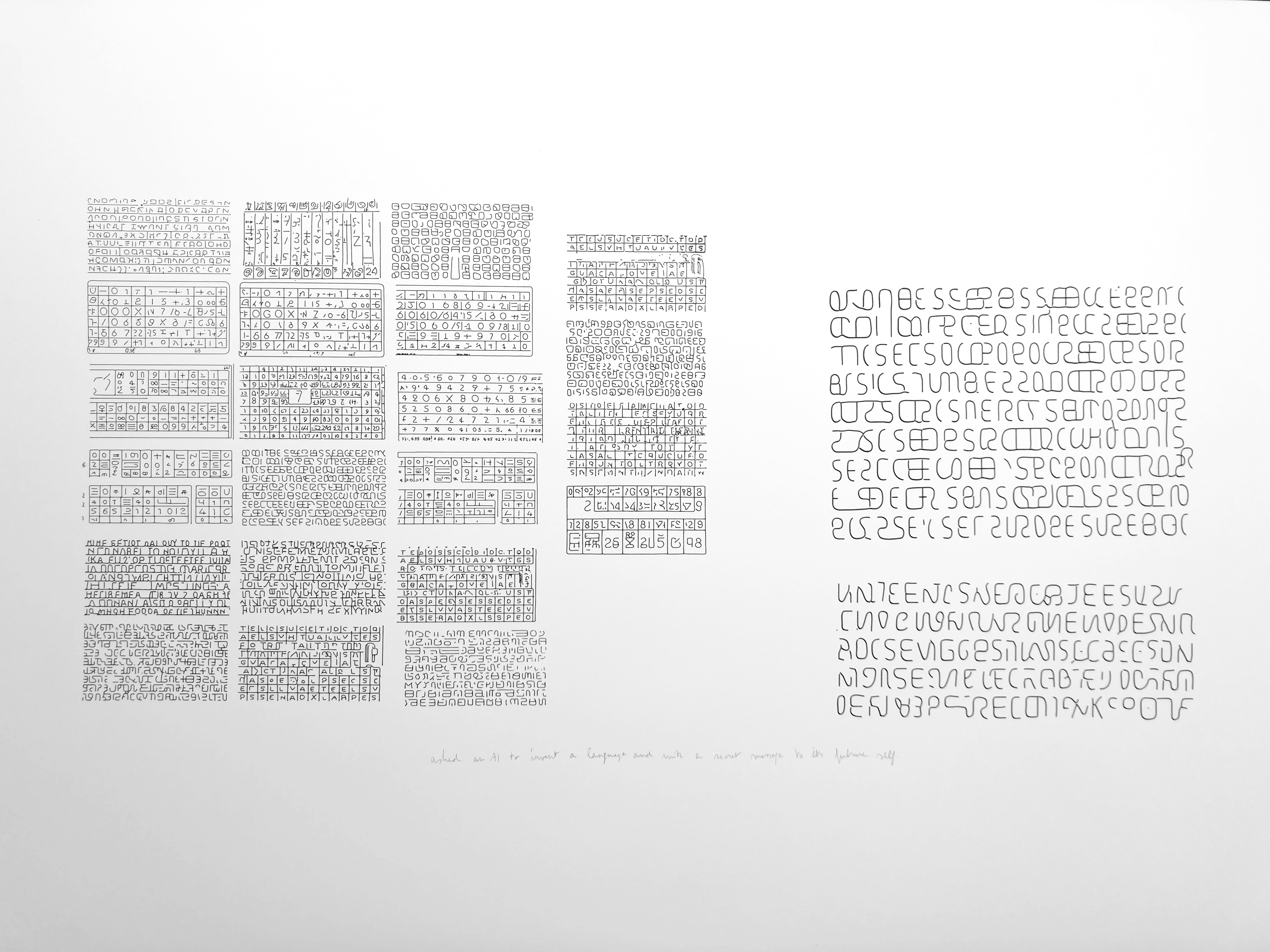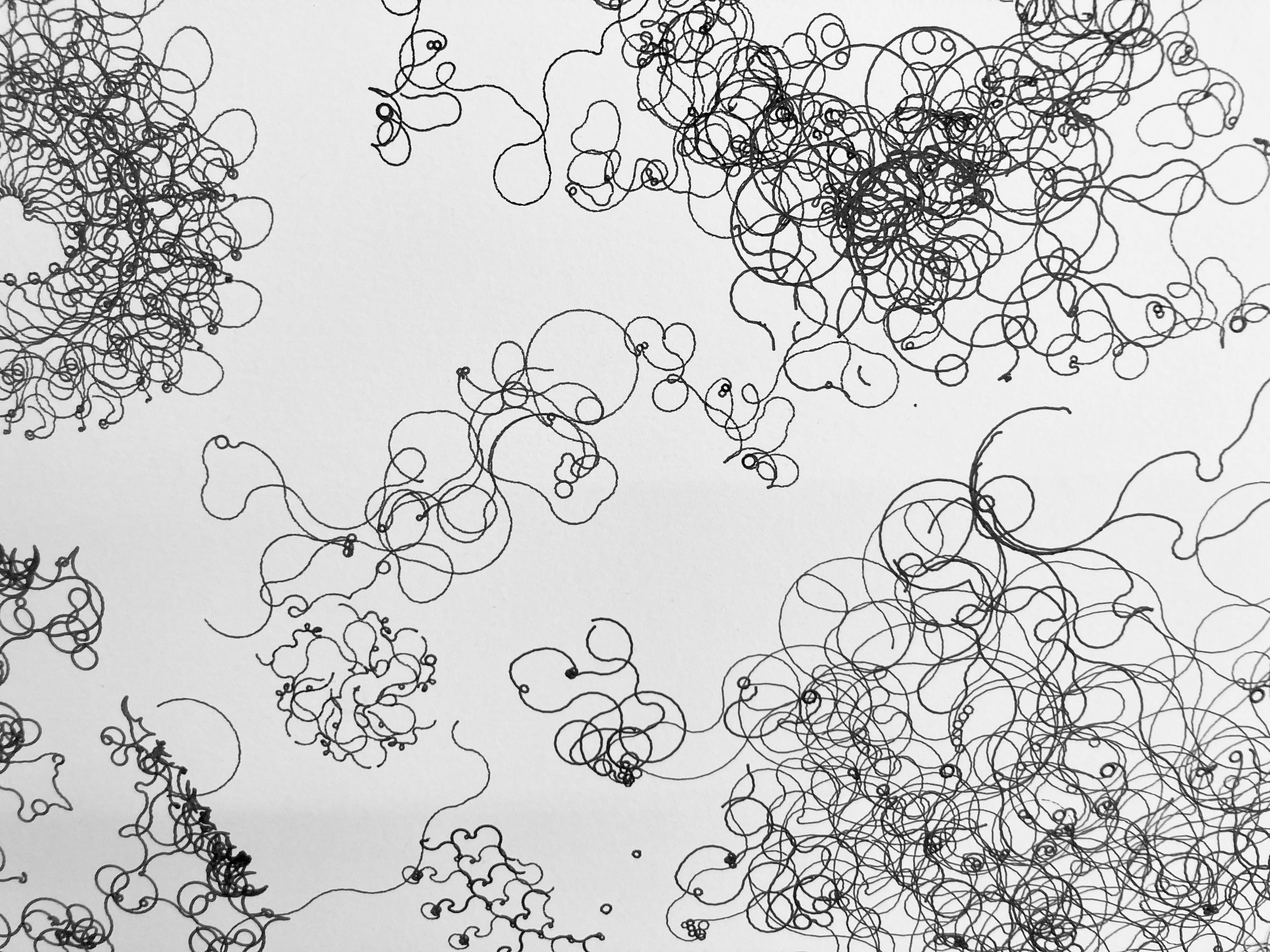 This series of robot drawings serves as a roadmap, exploring the associative relationships between organic beings, algorithms, cognition, artificial neural networks (ANNs), and randomness. I prefer to view these relationships as “carrier bags of fiction” rather than as predefined techno-weapons of certainty. There’s a deep humor in a single line attempting to describe organic or synthetic behavior, or even unthought processes—a sentiment vividly illustrated in the first published EEG below.